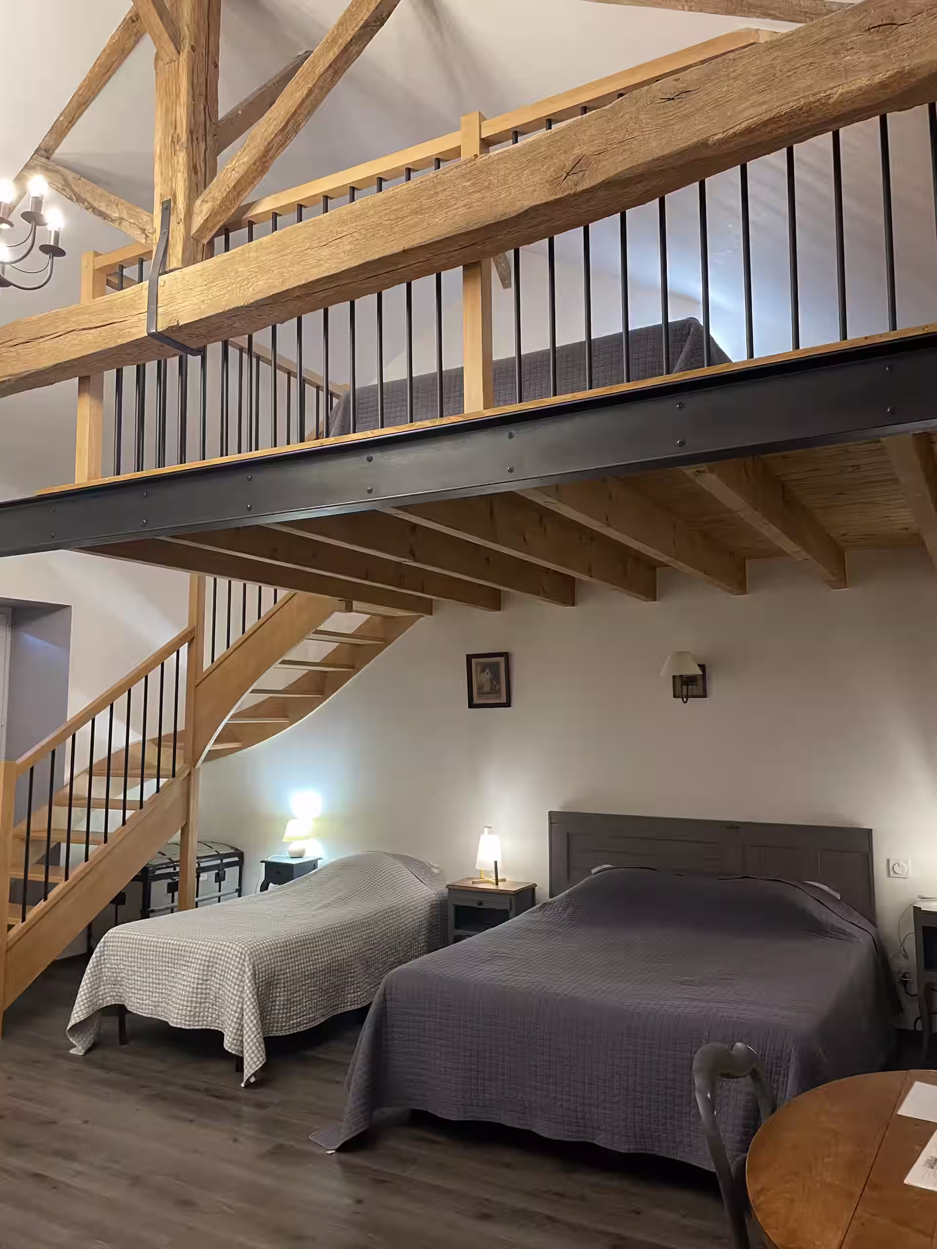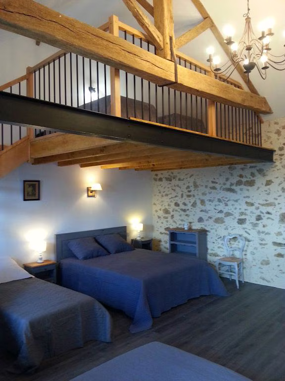 Nous vous proposons 2 suites familiales indépendantes au 2ème étage : une chambre familiale pour 6 personnes avec une mezzanine (2 lits Queen size + 2 petits lits ou 1 lit Queen size + 4 petits lits) ainsi qu'une chambre pour 4 personnes (1 lit Queen size + 2 petits lits de 90 cm). Chaque chambre totalement indépendante avec salle d'eau privative.
