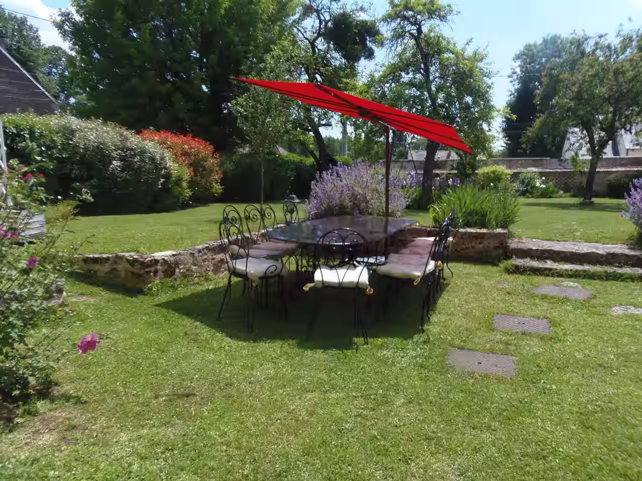 Grand jardin équipé : nombreux accessoires dont préau couvert, tables, chaises, parasols pour repas extérieur. Barbecue disponible. Espace idéal enfants jouer en toute sécurité.