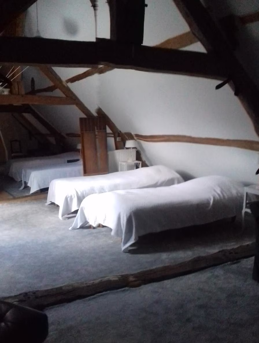 Configuration 4 chambres doubles avec lits 160x200 grand confort, une chambre triple, un grand (120 m2) dortoir 6 personnes. Trois salles d'eau, quatre WC pour confort collectif.